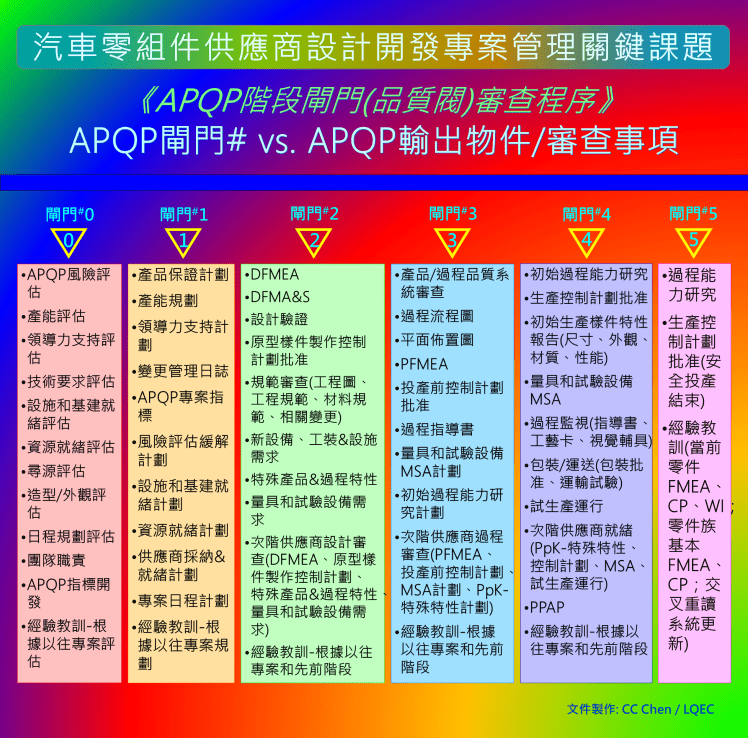 汽車零組件供應商設計開發專案管理關鍵課題–《APQP階段閘門(品質閥)審查程序》–APQP閘門# vs. APQP輸出物件/審查事項