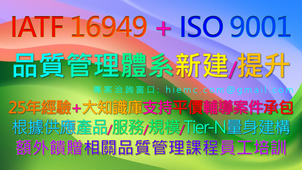 “IATF 16949 + ISO 9001 品質管理體系新建/提升輔導承包” 有 12 則迴響