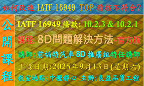 開課緣由 依據IATF(國際汽車工作組)於2025年5月27日更新之全球IATF 16949稽核結果的統計資料 … More 福特8D(TOPS)團隊問題解決方法-官方版 (1天)公開課程